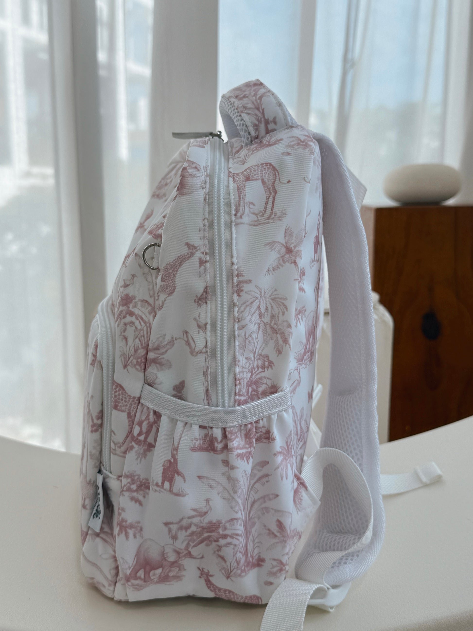 Adventure meets elegance with the Madeinlovekins School Backpack, thoughtfully designed for little explorers and style-conscious parents. Featuring our Safari Tales Toile print, this charming backpack brings a whimsical world of safari animals to life through delicate, illustrations in a timeless toile design.